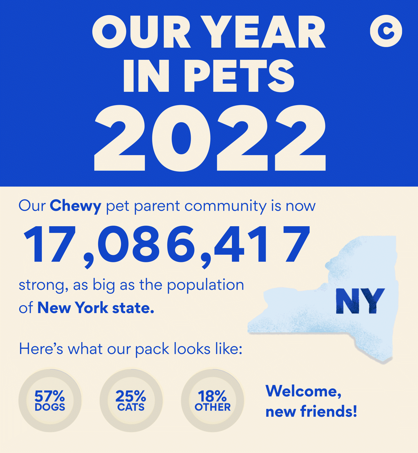 Chewy’s Year in Pets story is anchored by an infographic that highlights statistics from Chewy and other sources. The infographic lives on BeChewy, with social assets driving to the blog article. Chewy’s annual Year in Pets content has historically been among our biggest successes in December.